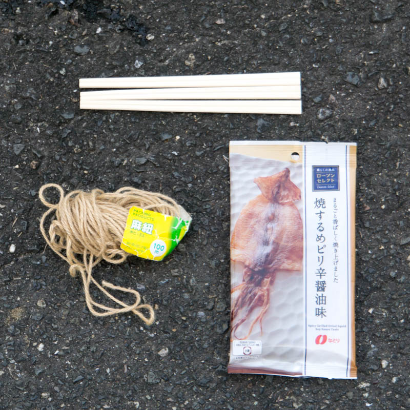 準備するものは糸、割り箸、スルメ。割り箸に糸と餌をつけて釣具に変身させるかたち。