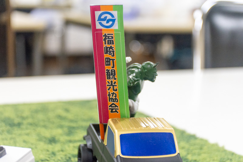 マシンの荷台部分には「福崎町観光協会」と書かれたのぼりと、ロボ(ダグラム)と鬼が積まれていました。