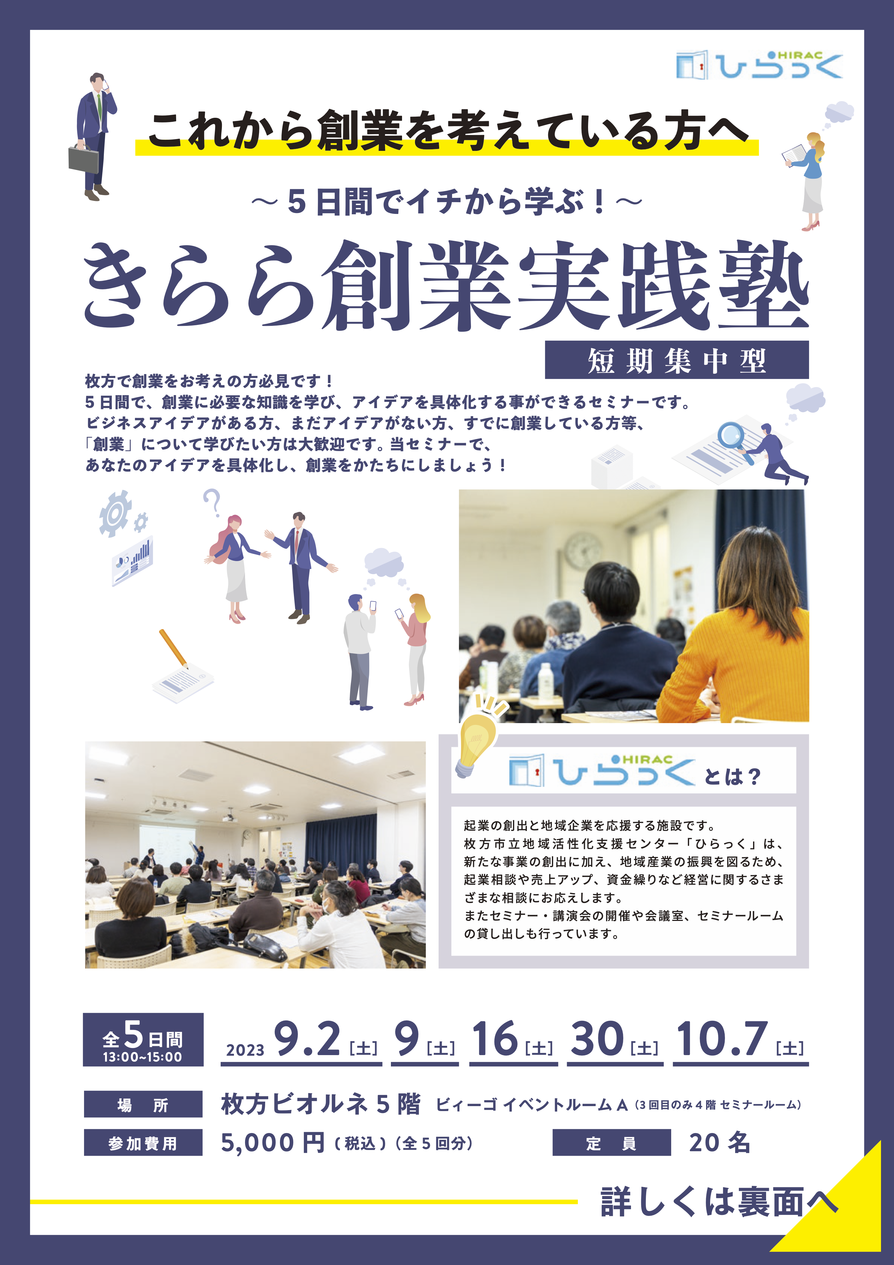 普段は1年間かけて創業を学ぶ枚方市立地域活性化支援センター(愛称:ひらっく)主催のきらら創業実践塾。そんな創業実践塾をぎゅ〜〜っと凝縮した短期集中型が登場