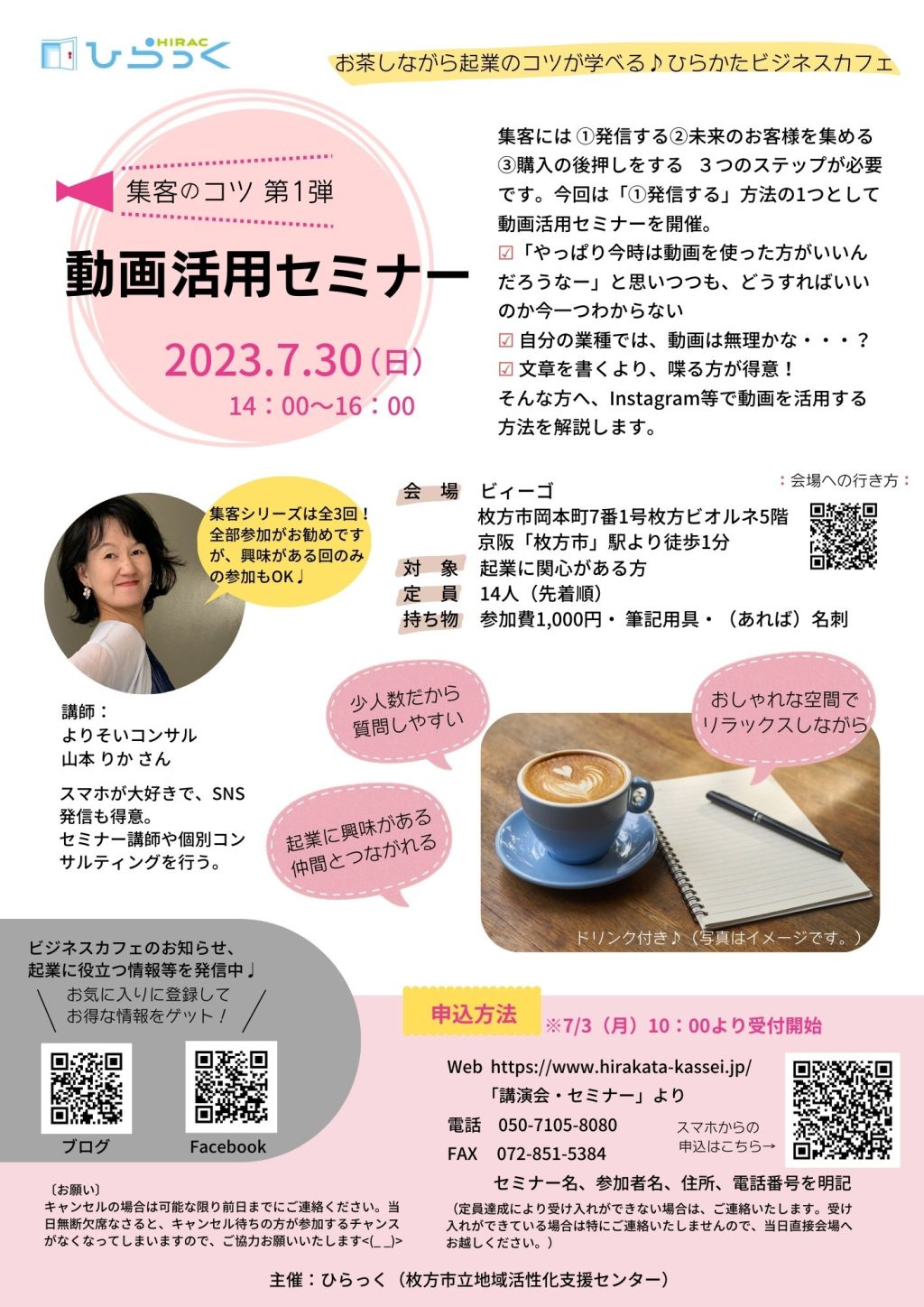 7/30(日)開催ビジネスカフェ!テーマは「動画活用セミナー」5日間でイチから起業を学べる塾も募集【ひらつー広告】