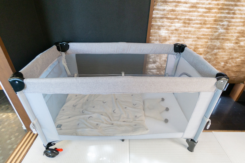 和室用2名、ソファベッド用2名分のお布団があって、赤ちゃん用ベッドもあります!
