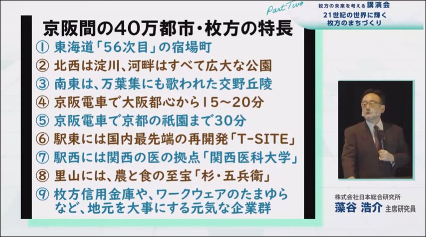 「21世紀の世界に輝く枚方のまちづくり」の講演会から再生されます。