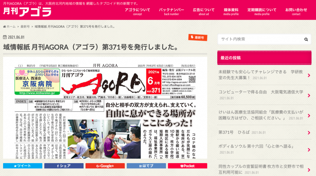 たゆらぎの活動については、北河内エリアの地域情報紙「月間AGORA(アゴラ)」でも取り上げられています。詳しい内容は月間AGORA(アゴラ) 公式サイトへ。