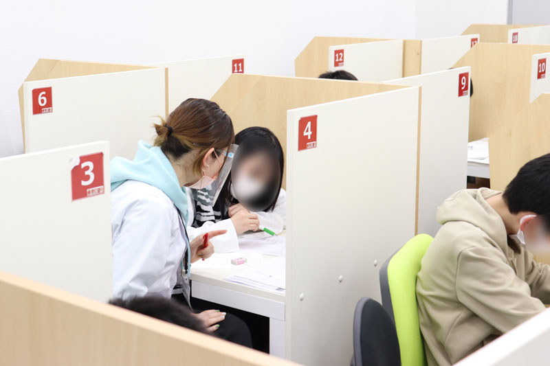 逆に手が止まっている様子の生徒に対して講師から声をかける場面も。