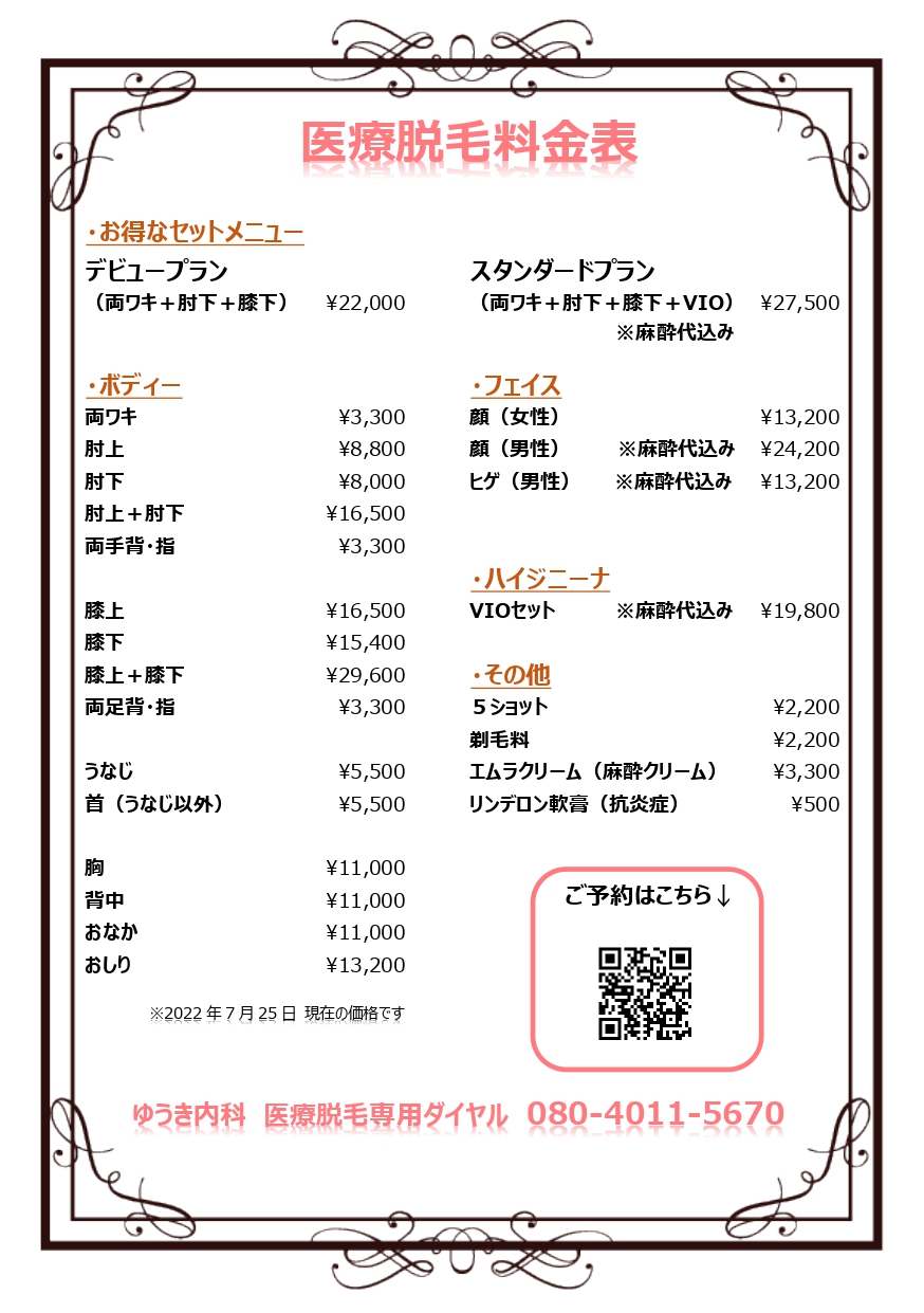 『ゆうき内科』での医療脱毛の料金表はこちら!