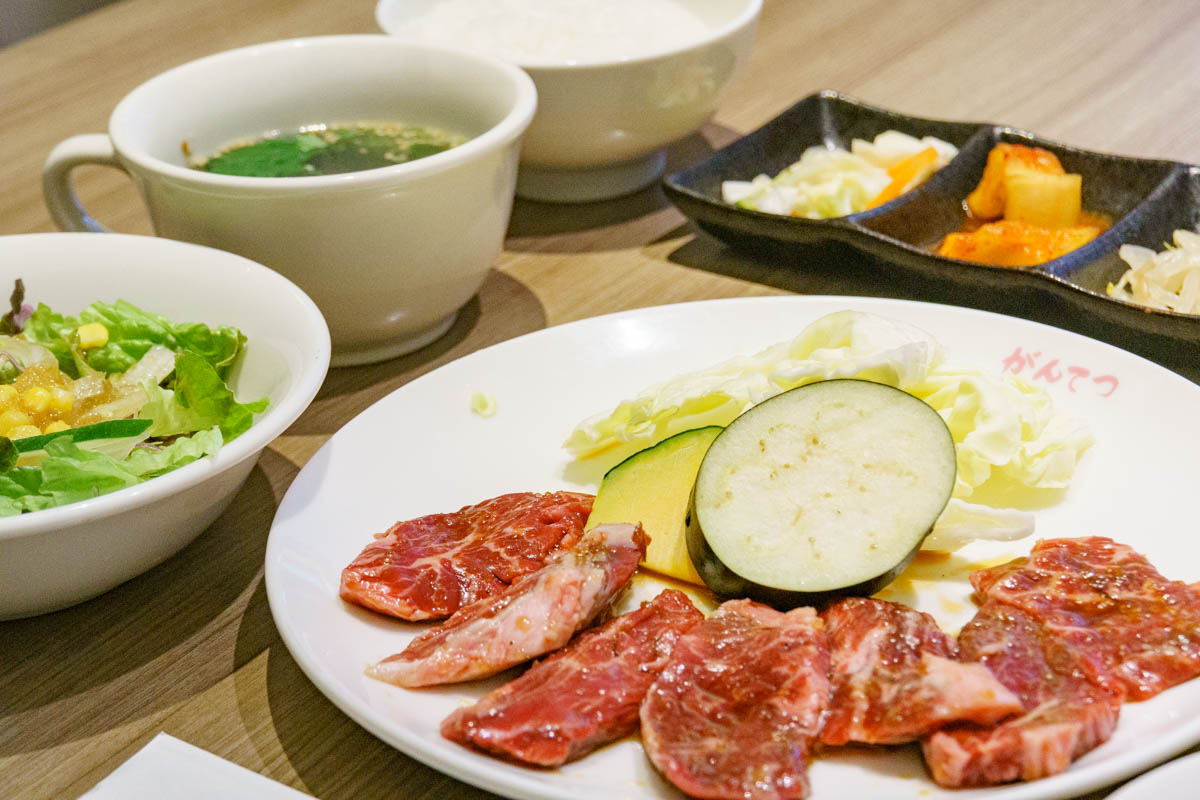 まず付け合せはサラダ、キムチなどがついた一品にワカメのスープ!焼肉屋さんのスープってめちゃおいしいですよね。