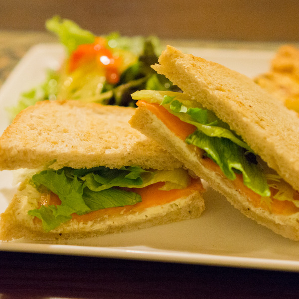 早速サンドイッチを食べてみると、サーモンのスモーク感と程よい塩っけ、そこにクリームチーズのマイルドな甘味がマッチしていい感じ。
