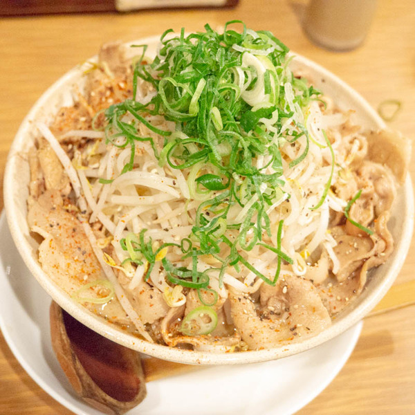 スープは意外とあっさりしたお味。二郎系のラーメンのようなこってり感を覚悟していたのですが、食べやすかったです。