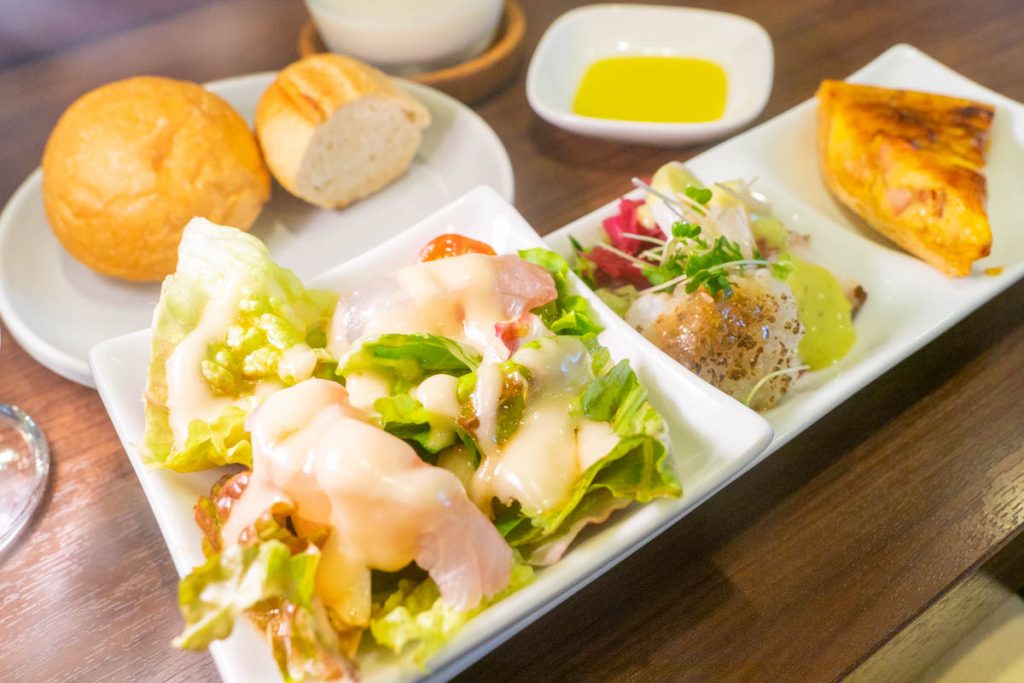 スープはこの日はヴィシソワーズで、前菜3種、パンorライスがセット。前菜はこの日はカルパッチョのサラダ、鱧をつかった料理、キッシュっぽいやつ(名前聞き忘れた)。