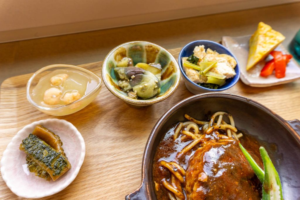 そしてこちらが「本日のランチ」。この日のメインはハンバーグで、カラフルな副菜がいっぱい!