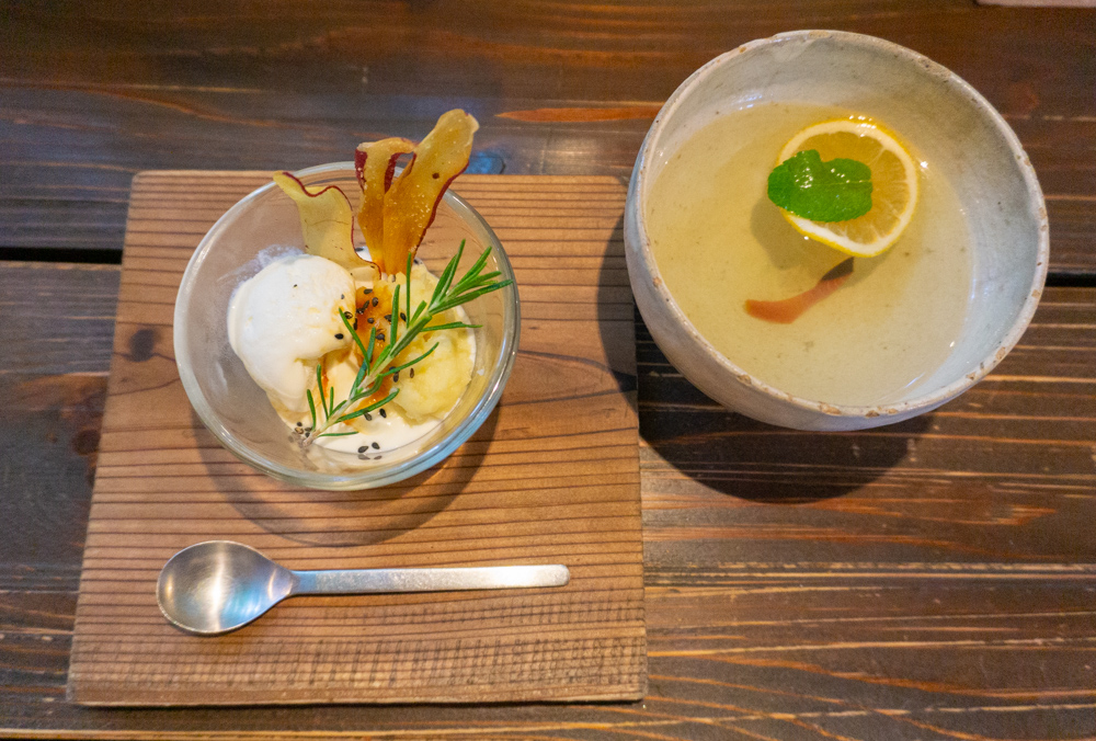 小さい秋見つけたいなってことで、秋の小さいデザート「自家製さつまいも餡とアイスクリーム〜みたらしソース添え〜」をチョイス(特に意味なし)