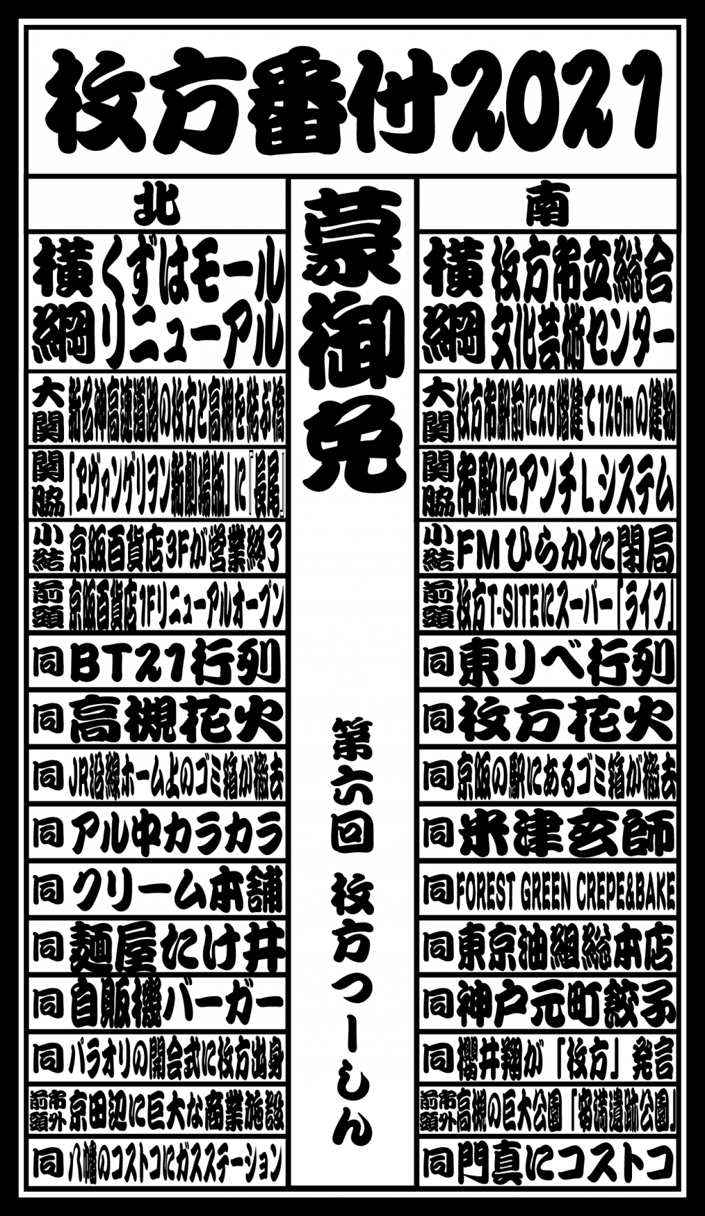 また、北と南の分類はだいたいで、下部には枚方市外の話題も入っていますが、そこはご愛嬌ということで!