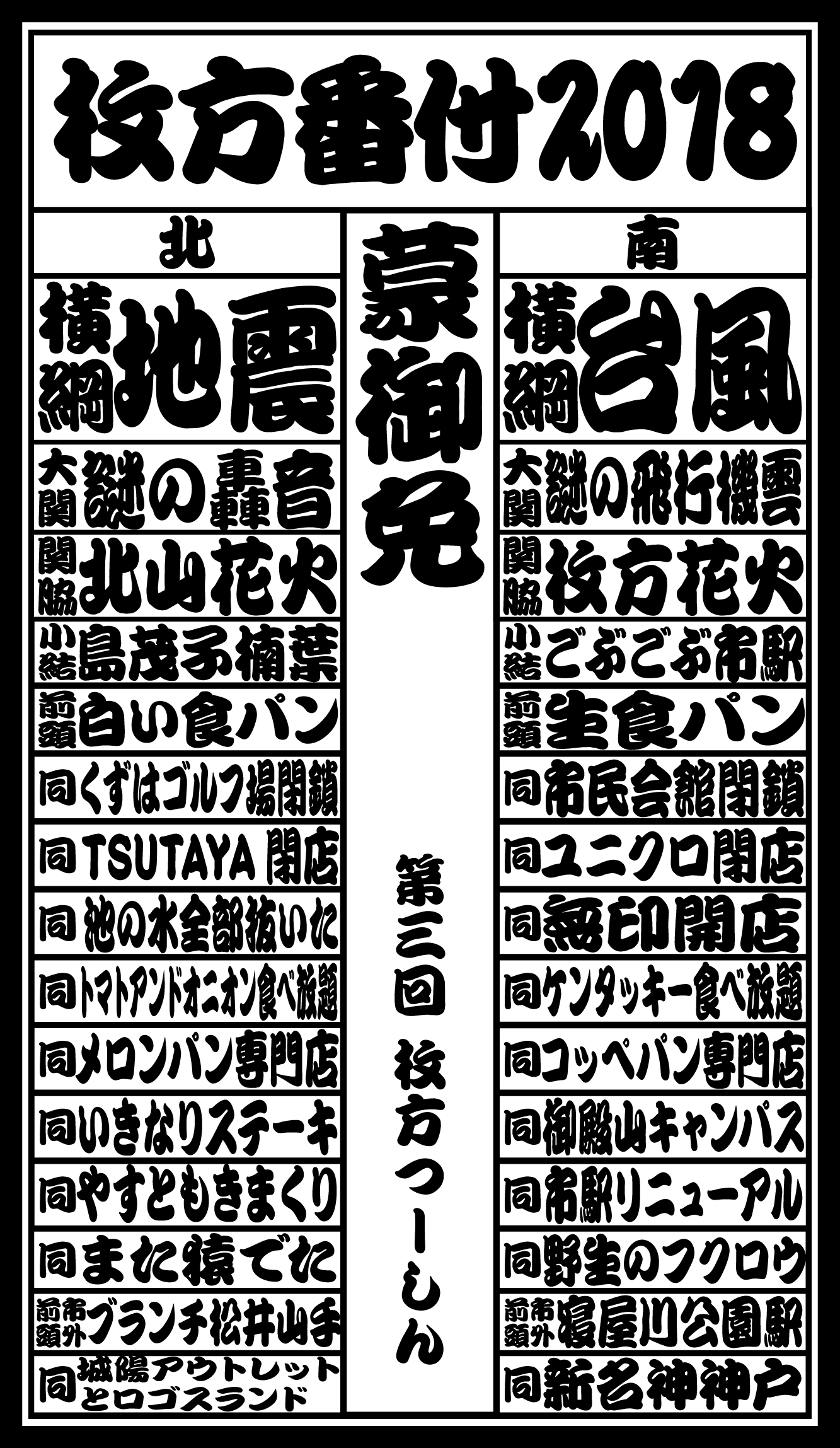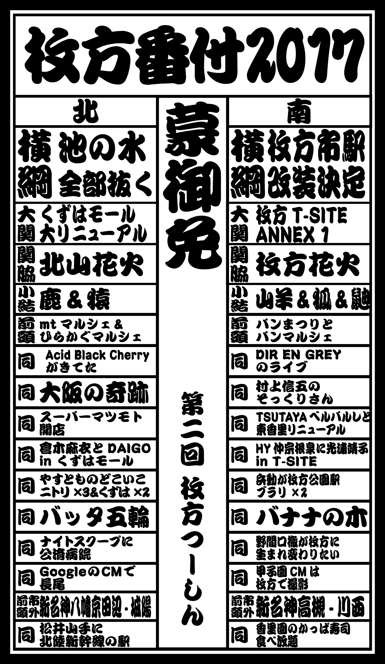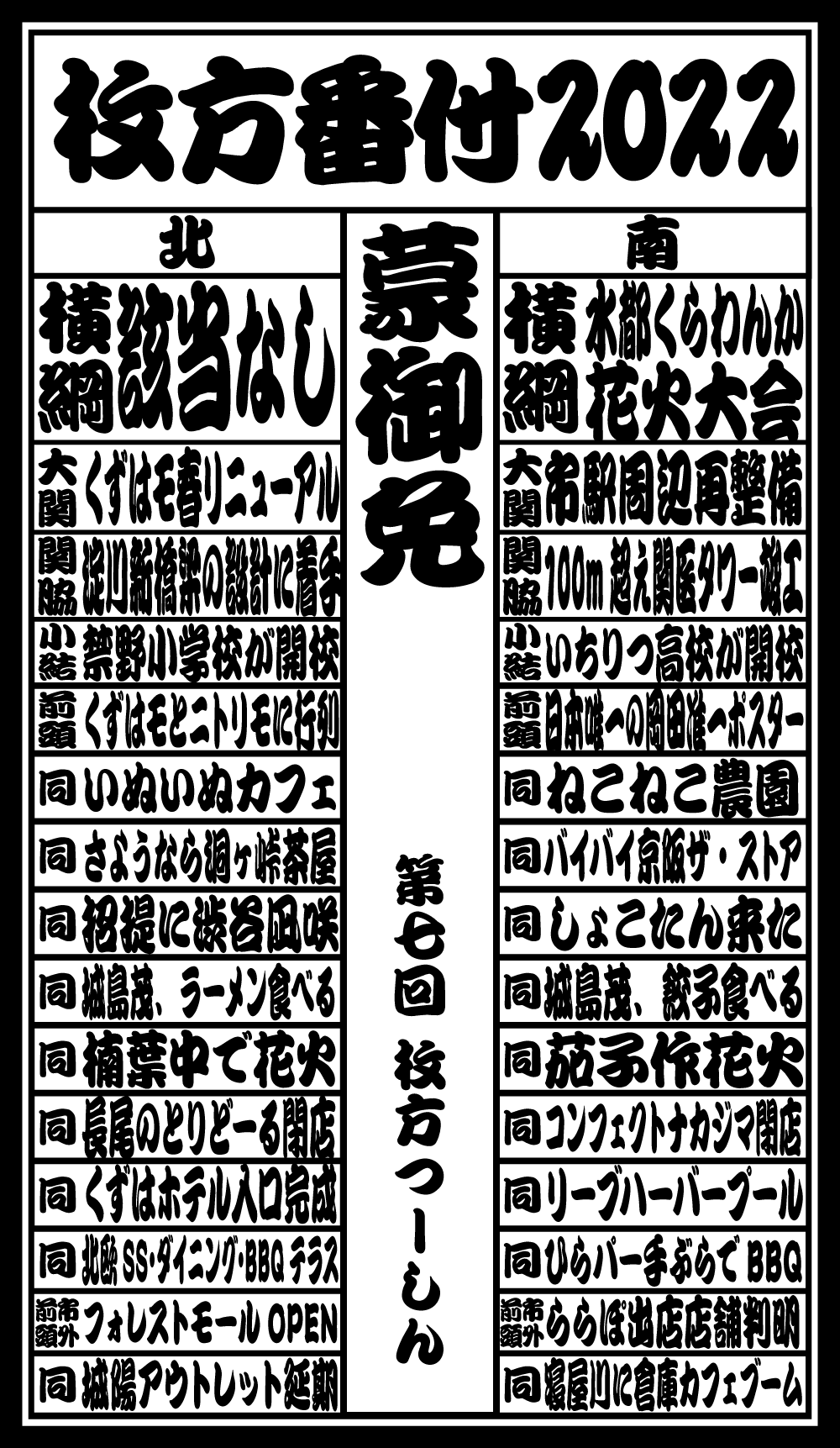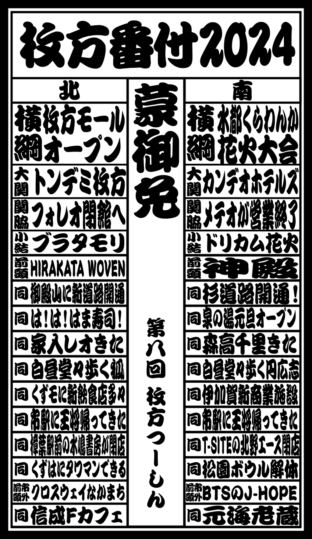 枚方つーしんでは2016年から、某経済紙に影響された企画「北の横綱・南の横綱 枚方番付」をお届けしておりまして、この記事ではその2024年バージョンとなっております。9年目!