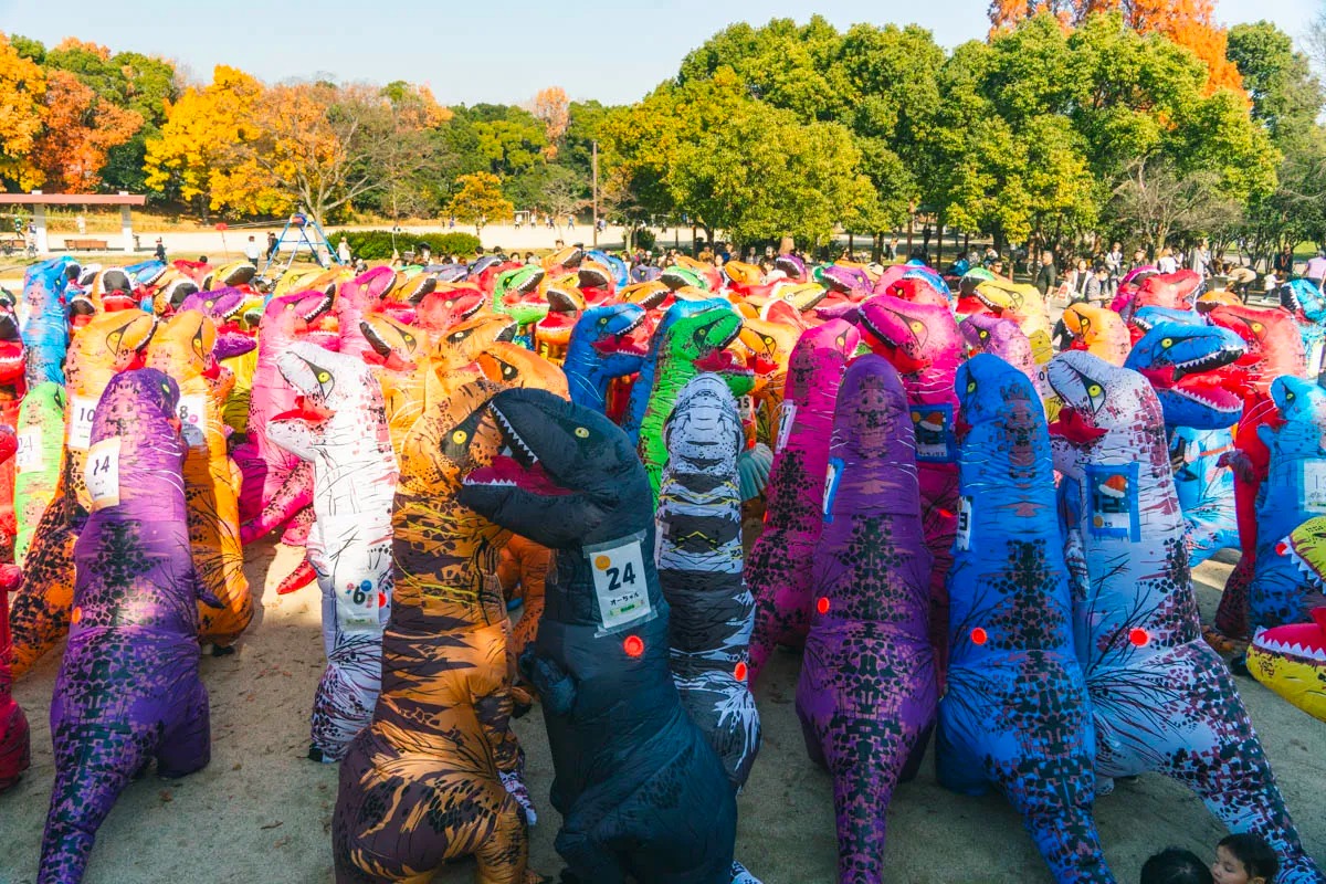 あのティラノレースが枚方で…!景色が圧巻なんですよね、これ。深北緑地のやつを見に行ったんですが、参加せずとも見てるだけでもワチャワチャして楽しそうでした。
