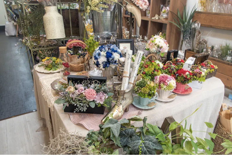2021年5月に鍵屋別館から南楠葉に移転した店内は、可愛らしいフラワー雑貨がズラリ。20年以上ウエディングに携わった店主さんが作るブーケは、喜ばれること間違いなし♡