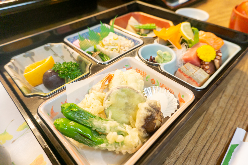 彩りが綺麗な天ぷらの他にもぶりんぶりんなお刺身などがセットになった和食弁当。