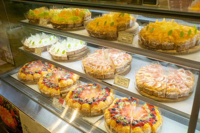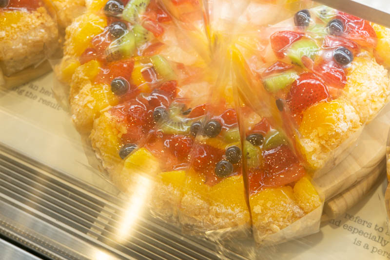 お店の前には色とりどりなフルーツたちがタルト上に盛り盛り〜!