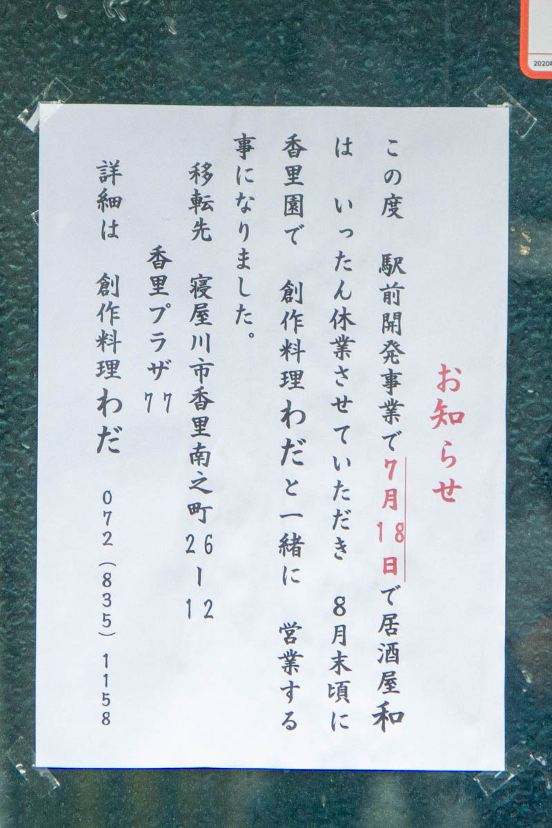 7月18日に一旦休業し、8月末頃に香里園にて、「創作料理 わだ」と一緒に営業することになったとのこと。