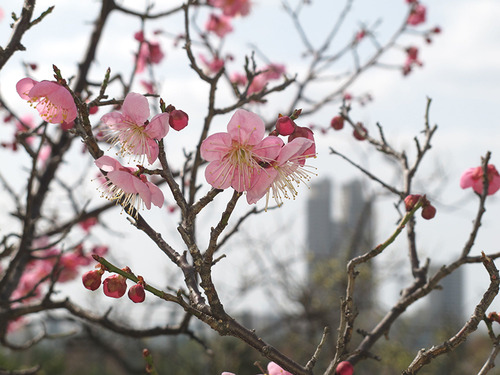 まだつぼみの木もありますが、山田池公園の梅がほぼ咲きそろっていました。園児たちやお花見の人たちで賑わい、シジュウカラの群れやメジロも梅に群がってました。美月橋の向こう側には桃色の枝垂桜も数本ありますが、梅は紅白桃色が混じって咲くほうが華やかですね。