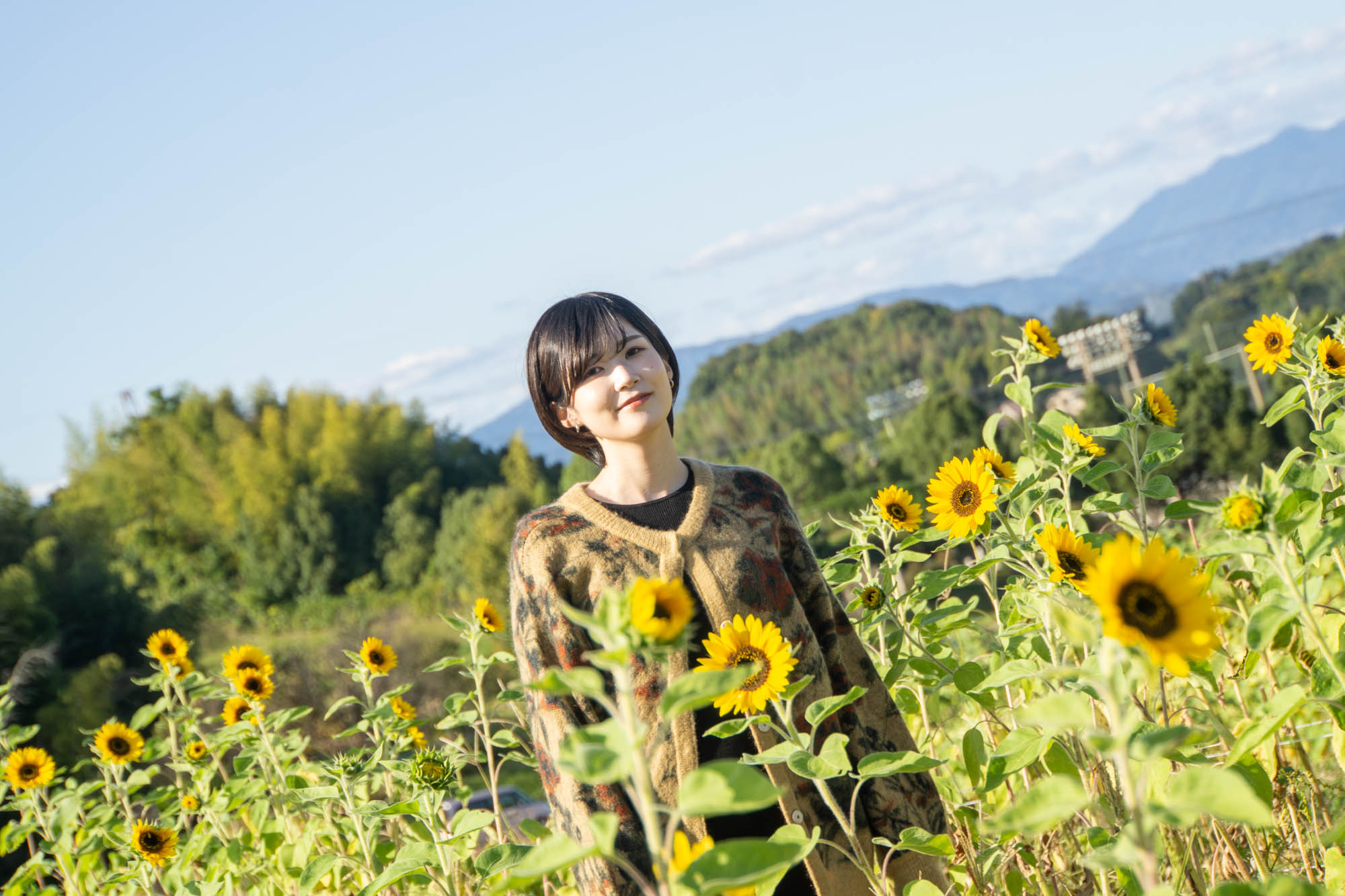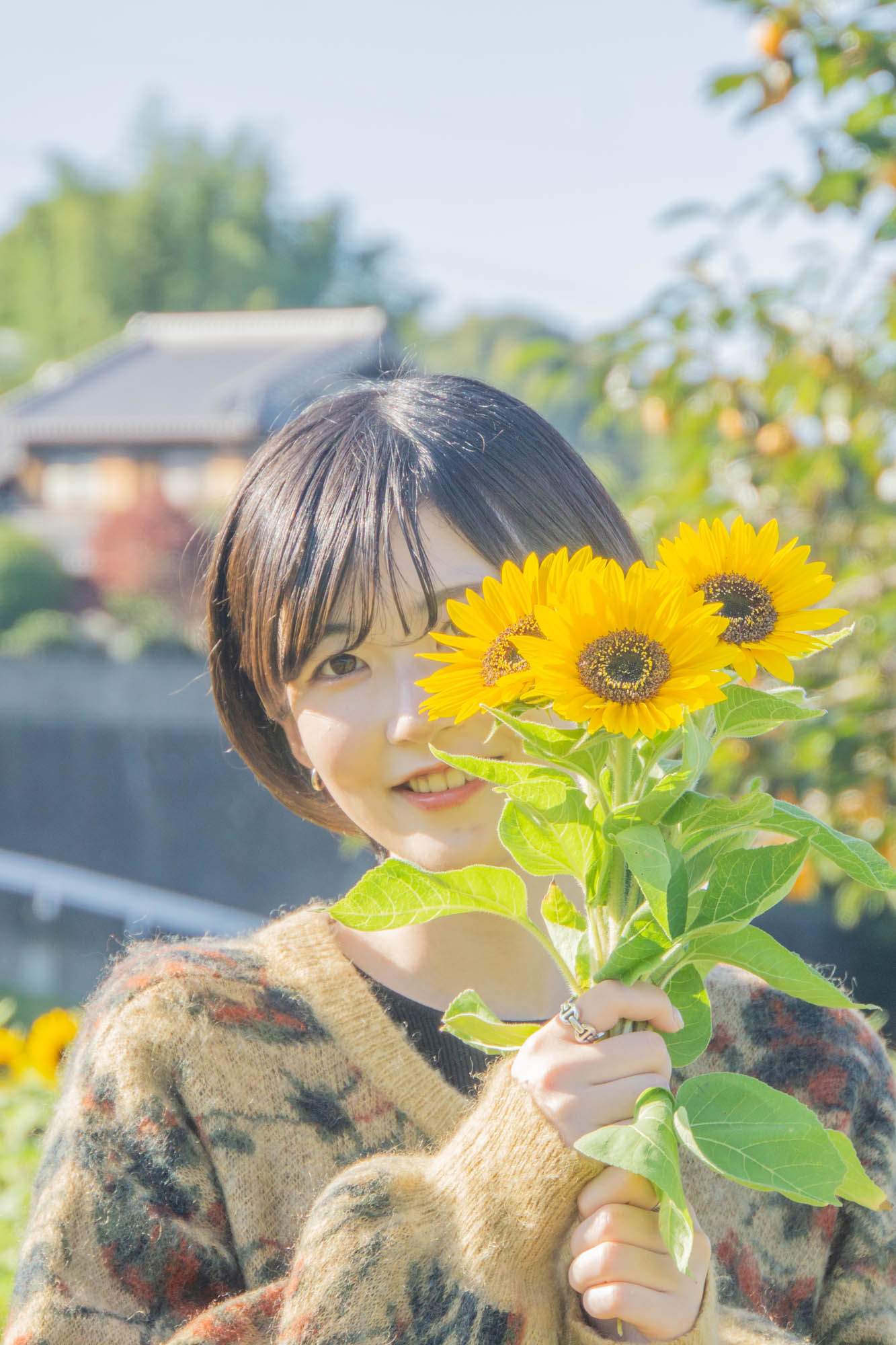 いつも花単体の写真だけなのは寂しいので、今回はひらつーのイメージキャラ「お枚の方」にも同行してもらい、コスモスやひまわりと一緒に写ってもらいました!