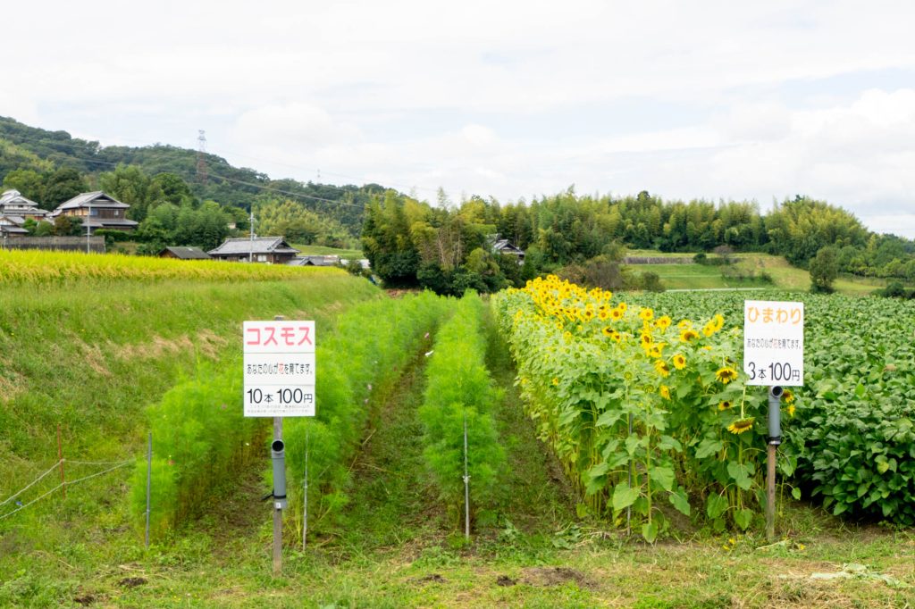 また、お花の摘み取りもできまして、コスモスは10本100円、ひまわりは3本100円。