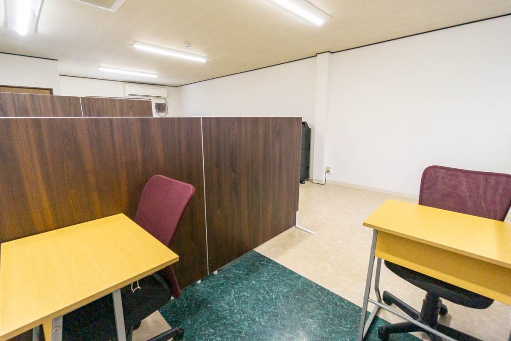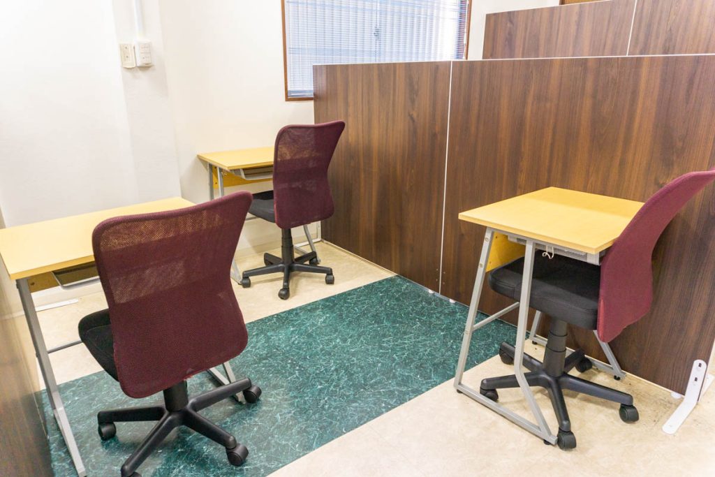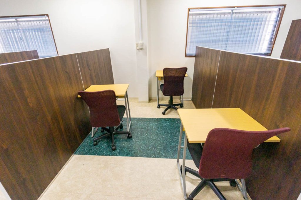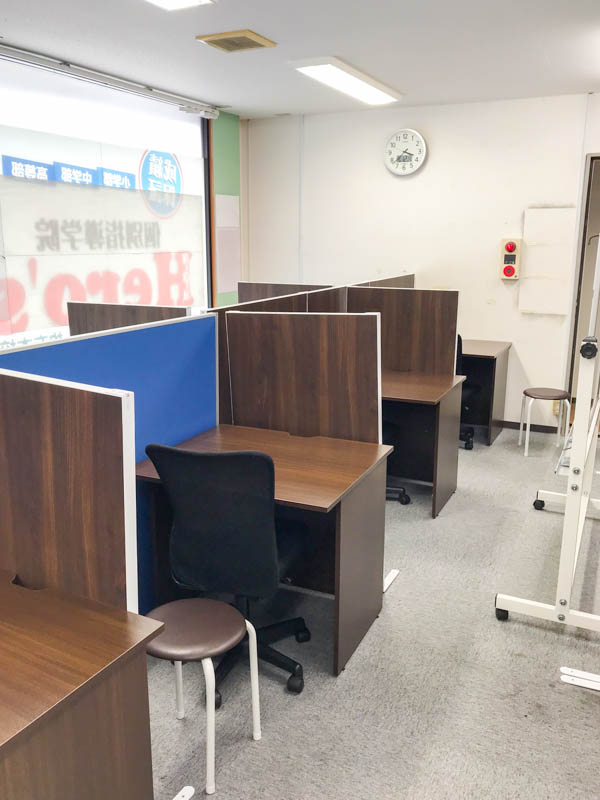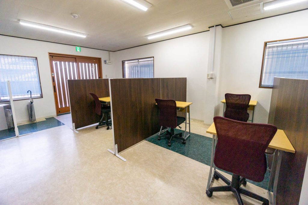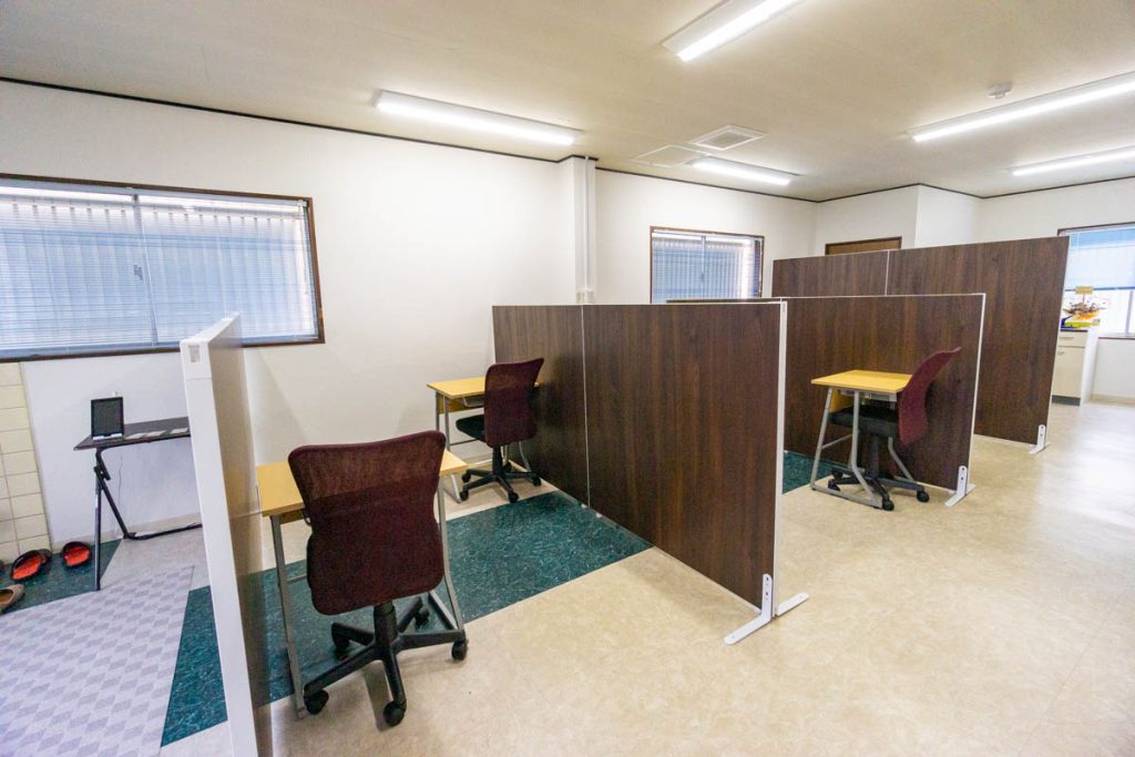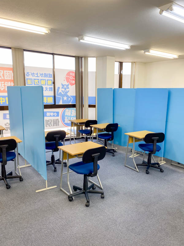 明るい教室内にはパーテーションに仕切られた机が並んでいます。