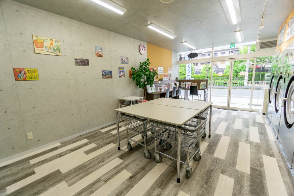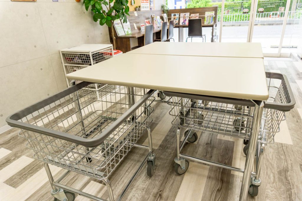 店内には、洗濯が終わった衣類を取り込んだり畳んだりするのに便利なキャスター付きカゴ&テーブルも。