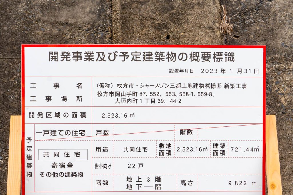 現地にあった概要標識によると、3階建ての22戸の共同住宅ができるようです。