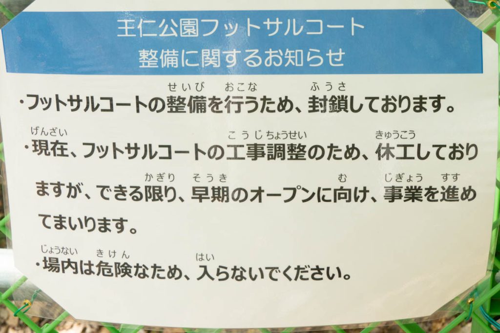 王仁公園にできる予定のフットサルコートの開設が遅れているようです。
