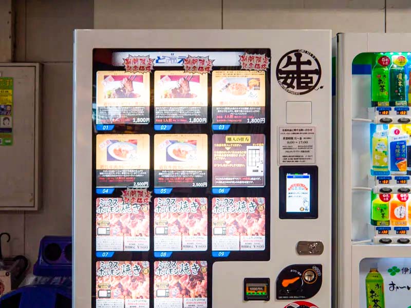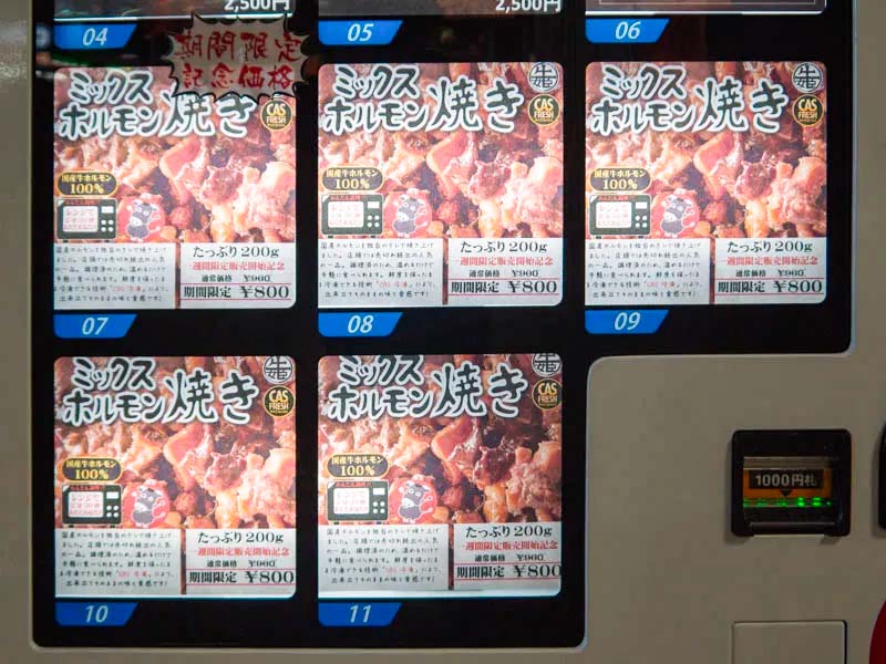 香里園の構内に「ミックスホルモン焼き」や「近江牛の赤ワイン煮込み」などを売る自販機が設置されています。