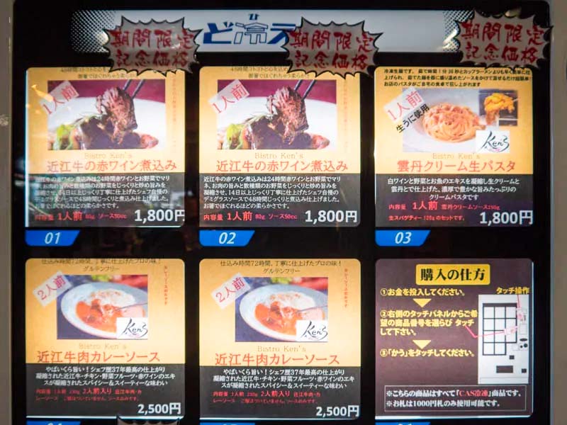 こないだ香里園に設置されたハンバーグステーキなどを売る自販機と同じようなラインナップ。あっちは香里南之町のフランス料理店「オマールエビと黒毛和牛のお店 ビストロケンズ」の自販機だったので、こっちも関係があるのかもしれません。
