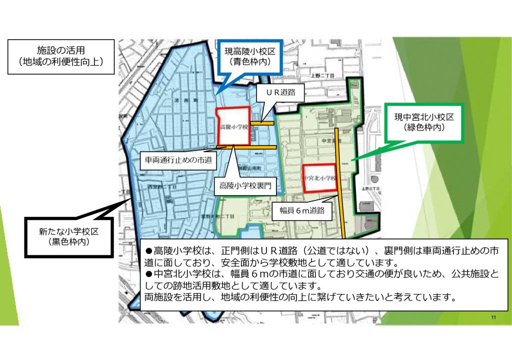 また、第2回中宮北⼩学校保護者説明会(→PDF)の14ページ目には正門、裏門についての説明も。