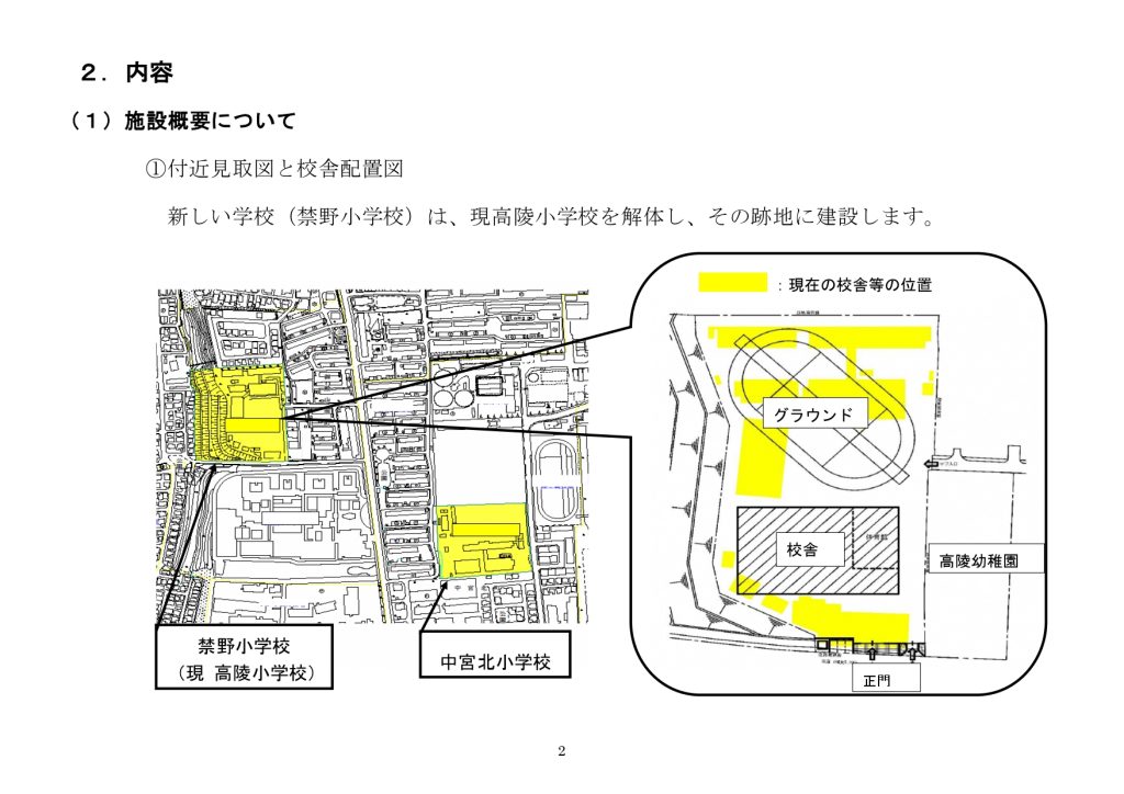 高陵小学校跡にできる禁野小学校の校舎配置図が公開されています。