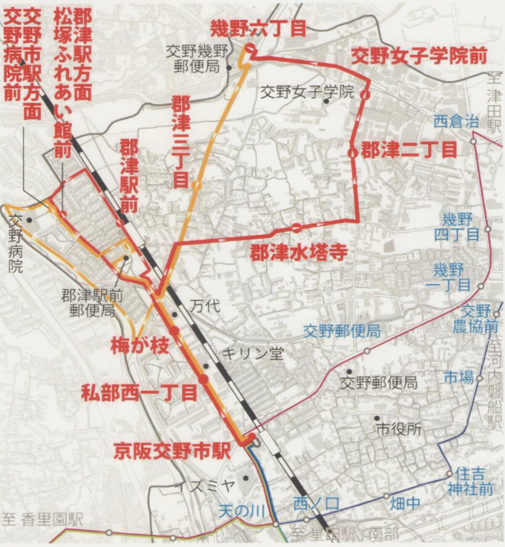 7月17日の記者会見によると、コミュニティーバスは京阪交野市駅を発着点として郡津駅を通り、松塚、郡津、幾野などを巡回するルートで1日7便運行。