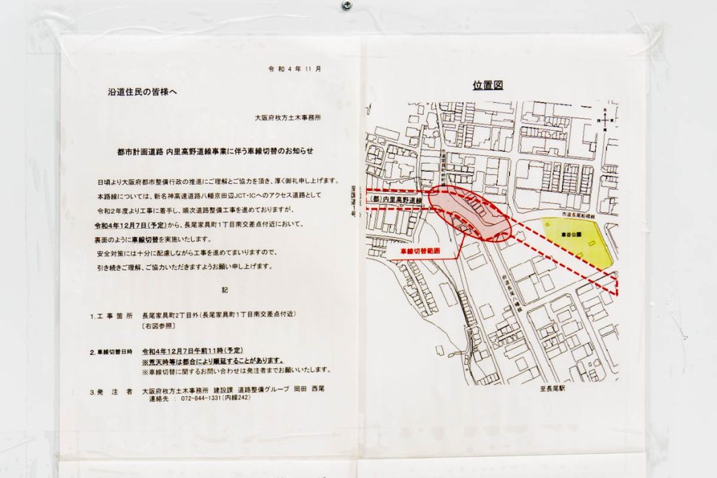 大阪府枚方市長尾家具町の1丁目と2丁目のちょうど境目の道路。
