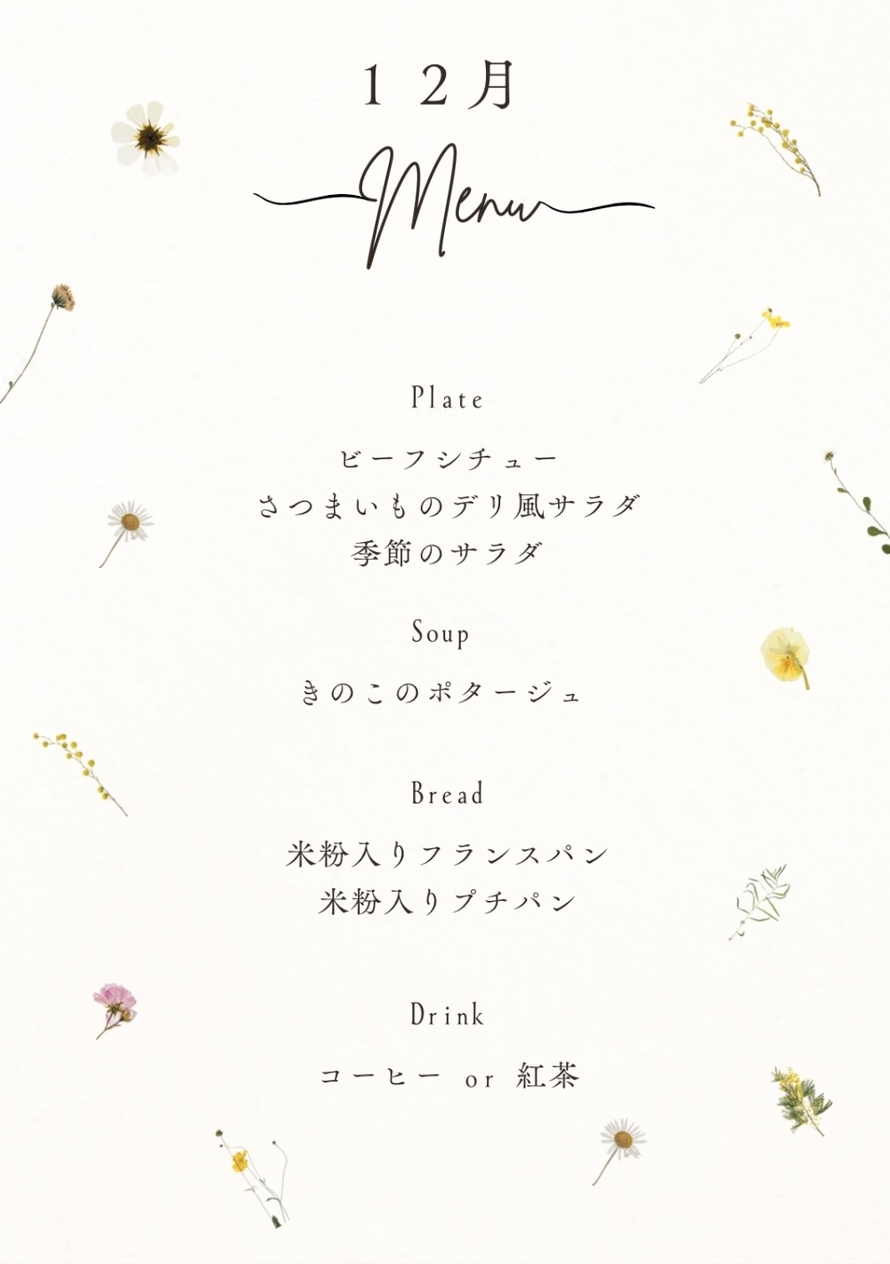 12月の日曜ランチのメニューです♪ 急に寒くなってきましたね〜 今月も野菜たっぷりのメニューで心も体 […]- 2025年12月5日