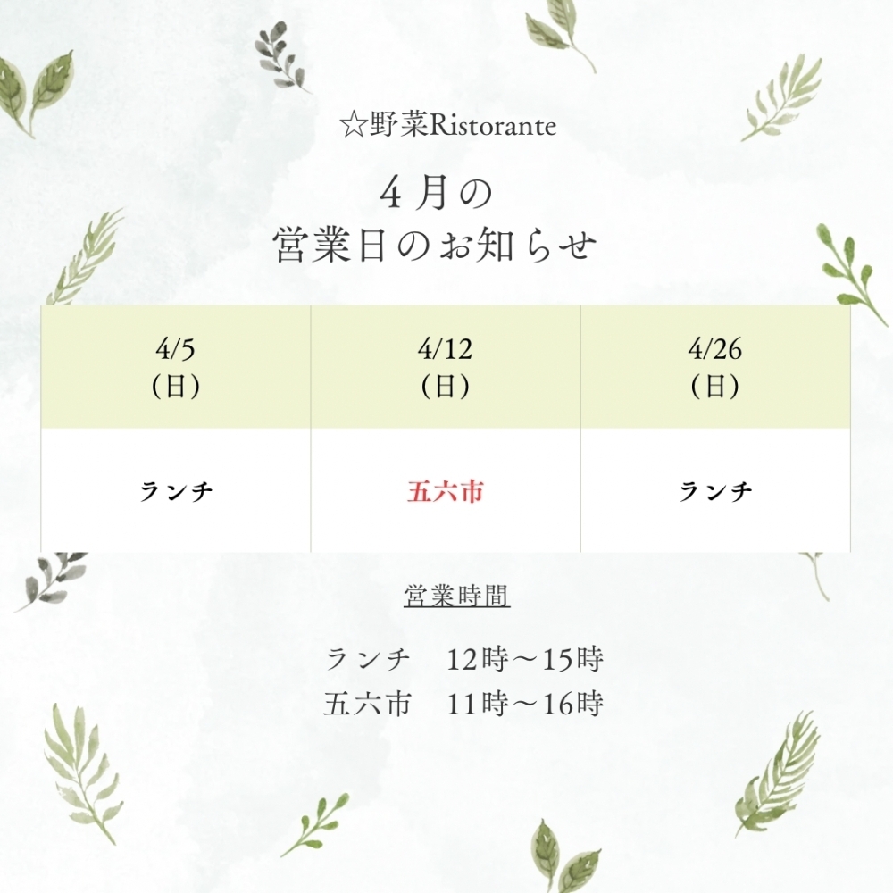 今月の日曜ランチ、たくさんのご予約のお問い合わせをいただき本当にありがとうございます! お断りするの […]- 2026年3月20日