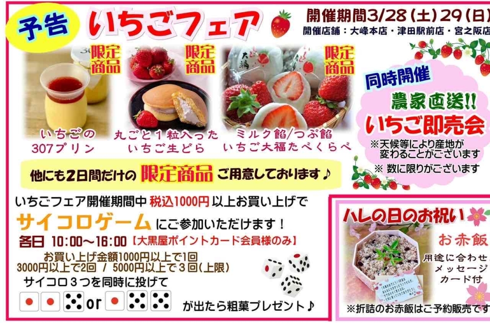 いつも和菓子・洋菓子 大黒屋 大峰本店をご愛顧いただき、誠にありがとうございます。おひなまつりフェア […]- 2026年3月27日