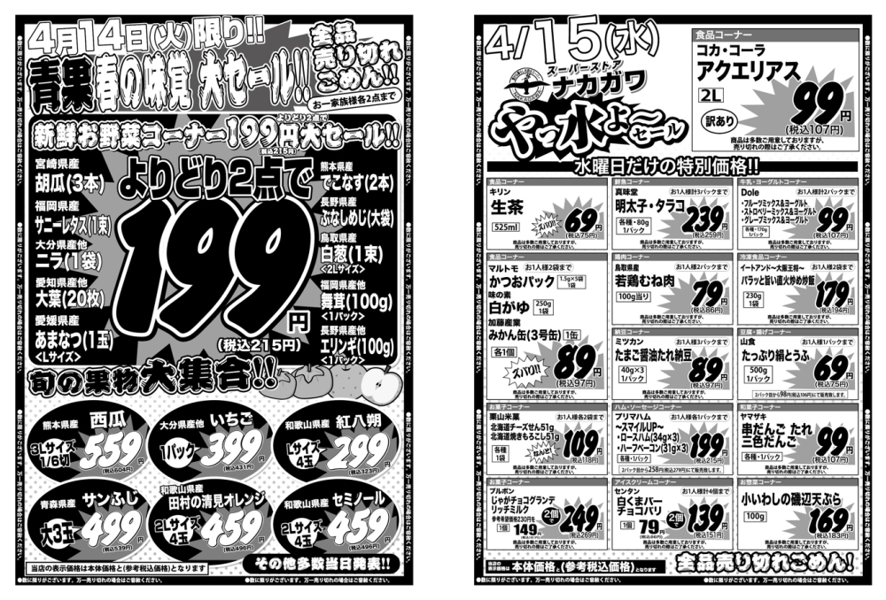 スーパーストアナカガワでは、4/16(木)〜4/19(日)の4日間、日替わり特価と4日間通しのお買得 […]- 2026年4月16日