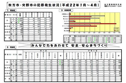 2010年1~4月分の枚方警察署管内の犯罪数がアップされていました。(画像の緑の点は僕がつけたものです。元のPDFファイルで見たい方はこちら)総数としては2141→2151件と0.5%ぐらいの変化しかありません […] -