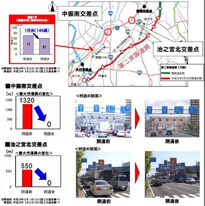 第二京阪開通後1ヶ月時点での交通量調査結果。大日→招提で5割時間短縮。