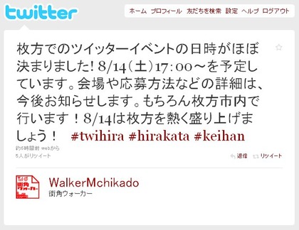 枚方ウォーカー主催の枚方Twitterイベント開催決定。枚方つーしんも参加します