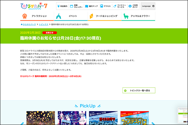 ひらパーが臨時休園。明日2月29日から3月18日まで