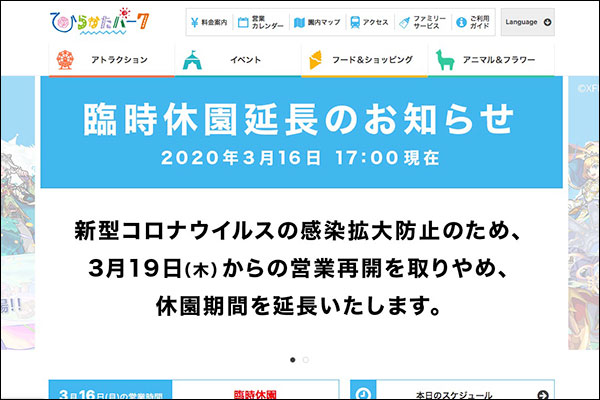 ひらパーが臨時休園期間を延長してる。再開日は未定