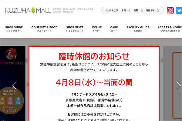 くずはモールが4月8日から当面の間休館するみたい。ダイエーなど本館一部食品店舗は引き続き営業
