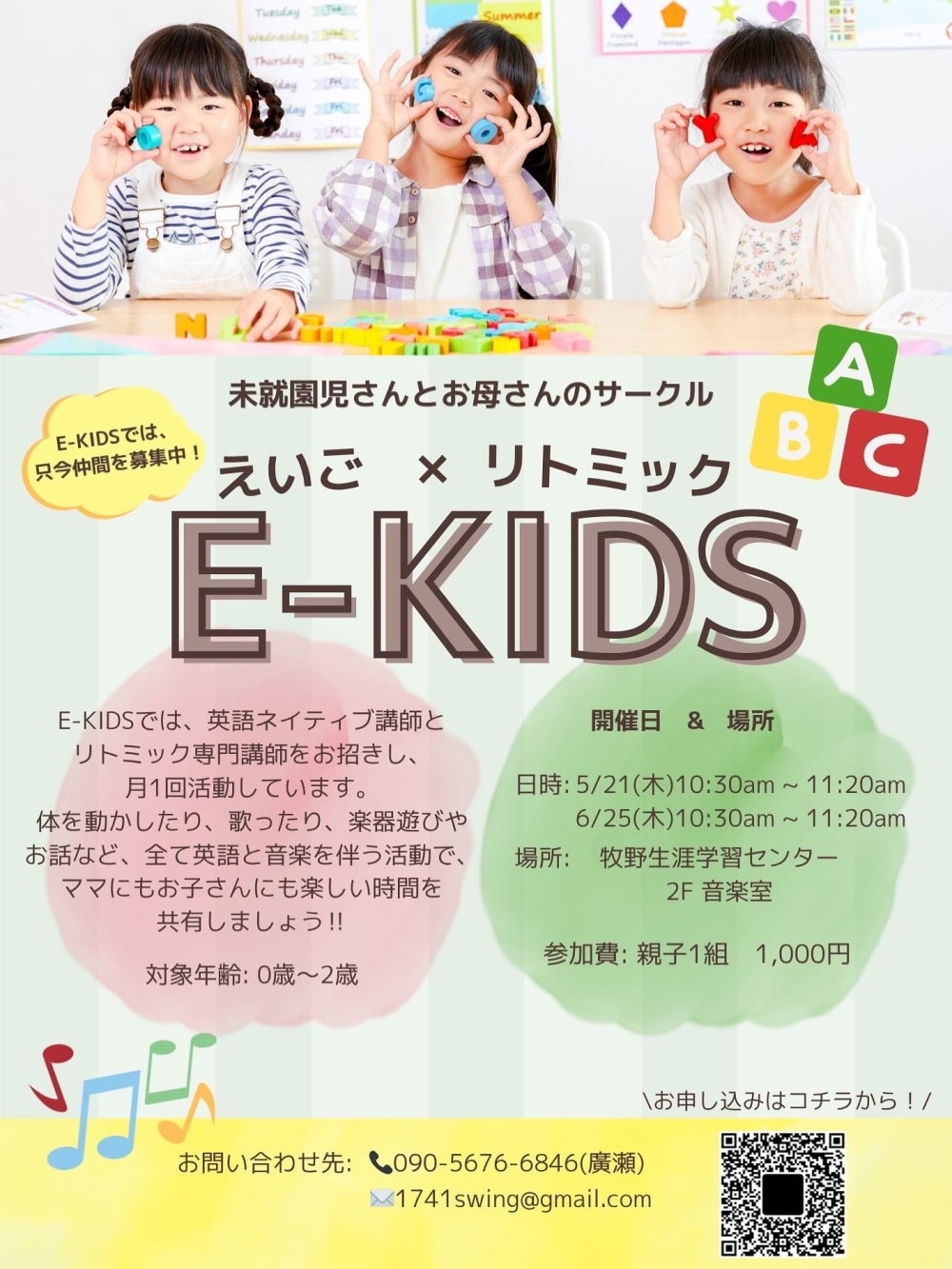 未就園児さんとお母さんのためのサークル「E-KIDS」をスタートします英語とリトミックを組み合わせた活動で、親子で楽しい時間を過ごしませんか。