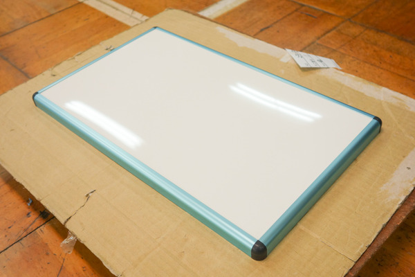 こだわりポイント:表も裏も真っ白のシンプルな「メラミンホワイト」をチョイス。枠は透き通るようなきれいな水色!!
