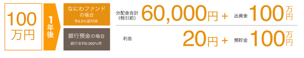 たとえば100万円を出資して頂いて『なにわファンド』で年6.0%(税引前)で運用した場合、1年後に得られる利益は6万円(税引前)になります。一方、金利が年0.002%の銀行に100万円を預けた場合、1年後に得られる利息は20円です。