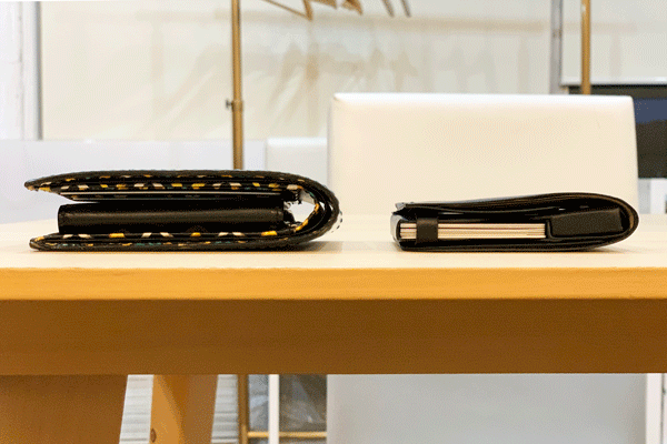 左がシュンが元々使用していた一般的な二つ折り財布。右が『usuha2』。
