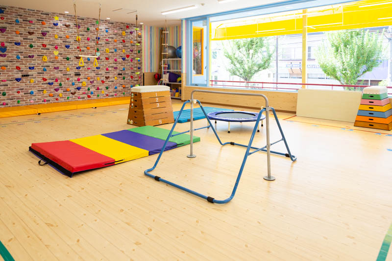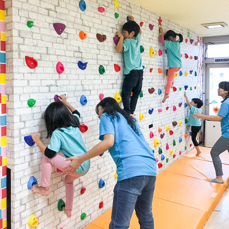 写真のようなボルダリングやマット運動、跳び箱など、楽しみながら健康で丈夫な身体の成長をサポートしてくれます。